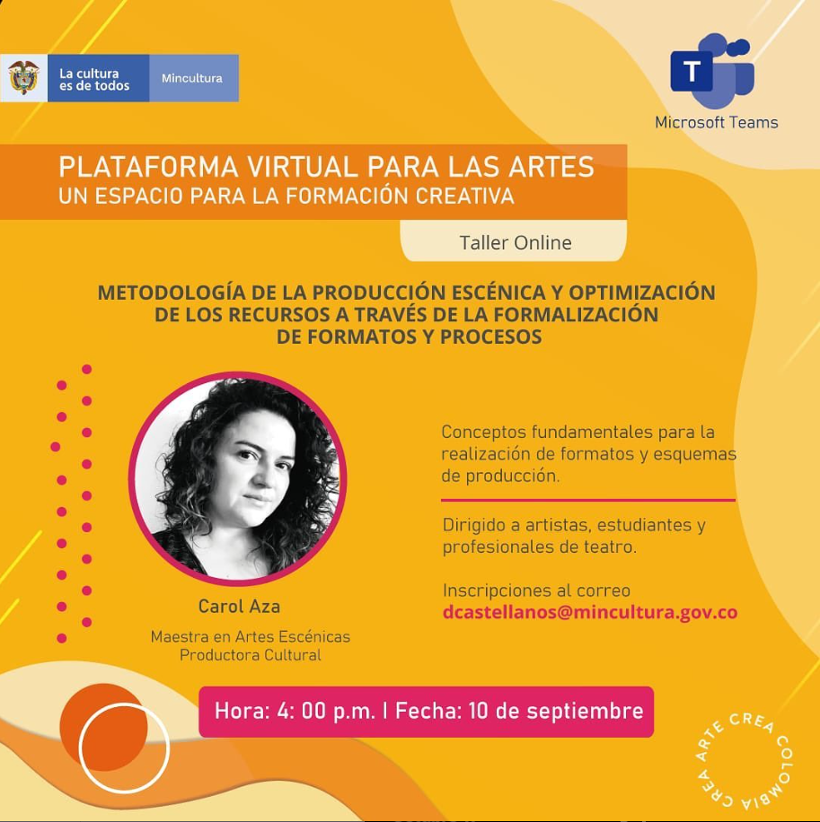 El objetivo del taller es brindar los conceptos fundamentales para la realización de formatos y esquemas de producción y las variantes que se pueden presentar de acuerdo con la manifestación artística que se vaya a producir.